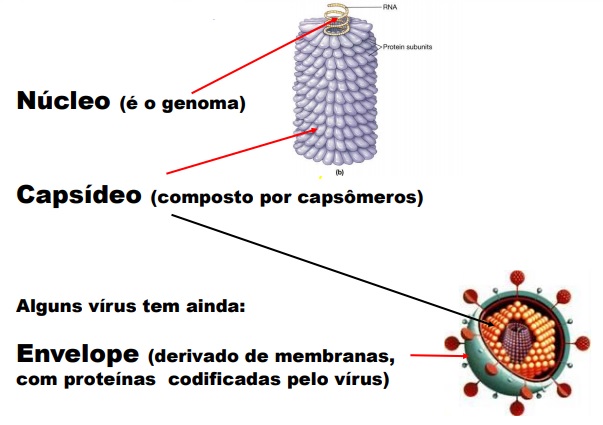 O que são vírus? Os vírus são seres diminutos, medindo cerca de 0,1µm (10-7m) de diâmetro, com dimensões apenas observáveis ao microscópio eletrônico. A estrutura de um vírus contém: ácido nucleico: DNA (ácido desoxirribonucleico) ou RNA (ácido ribonucleico) • Capsídeo: do latim “capsa” significa caixa • Nucleocapsídeo: ác. nucleico + capsídeo • Matrix: proteína que preenche o espaço entre o capsídeo e o envelope • Envelope: membrana viral.